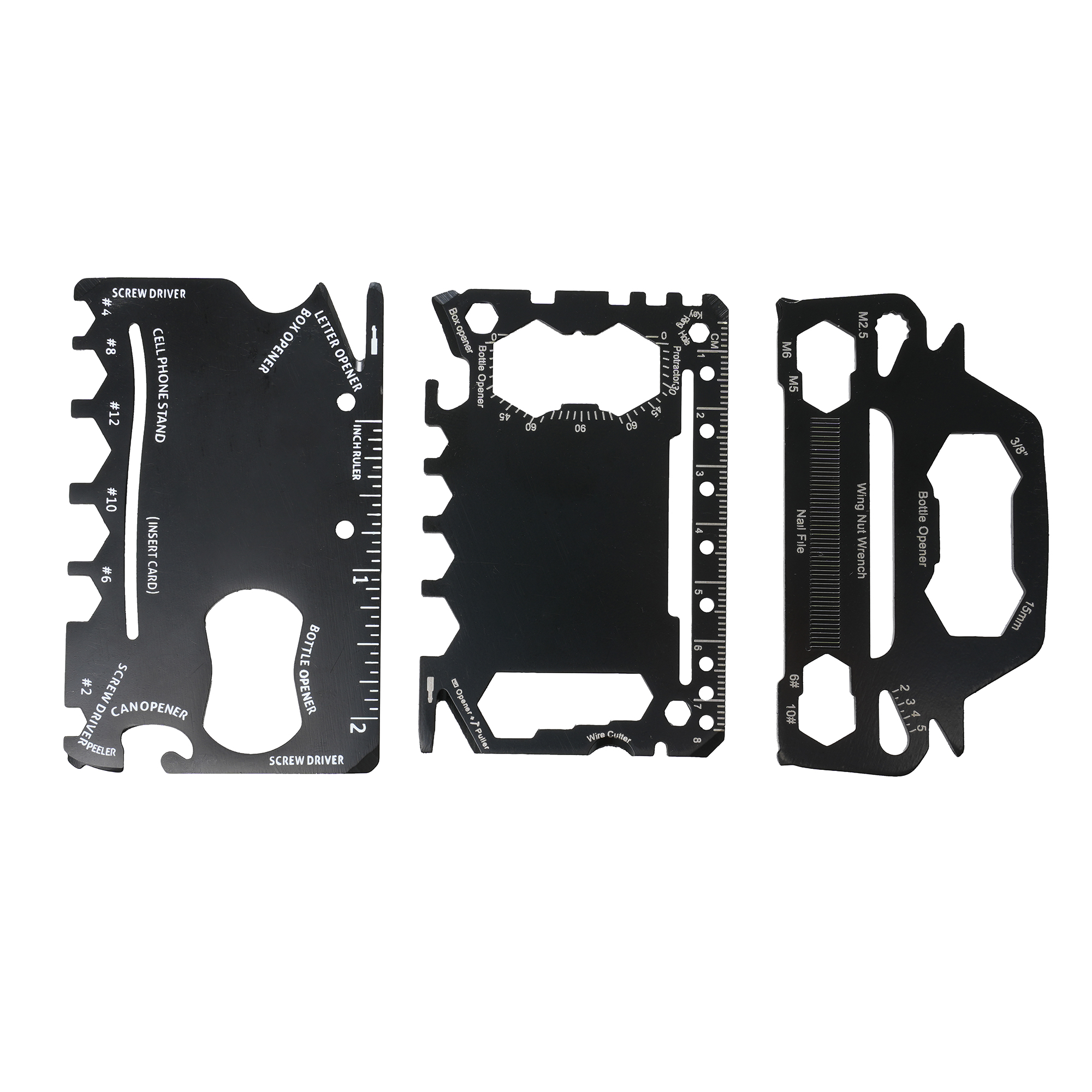 Stainless steel credit card–sized multi-tool with screwdrivers, bottle opener, wrenches, ruler, box opener, wire cutter and more. Other shapes and PU sleeve available at an additional cost.